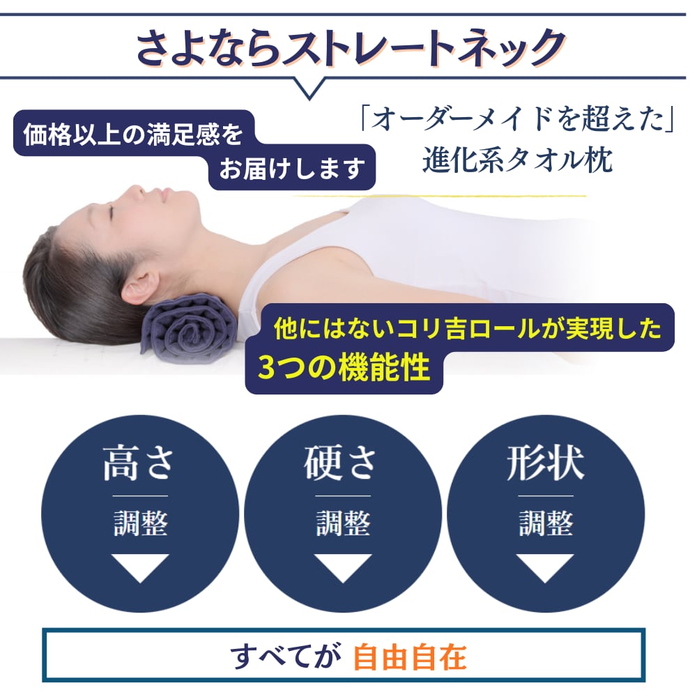 今治製のタオル枕で肌触り耐久性にも優れています。コリ吉ロール ワイドタイプで、快適な朝をご体感ください。